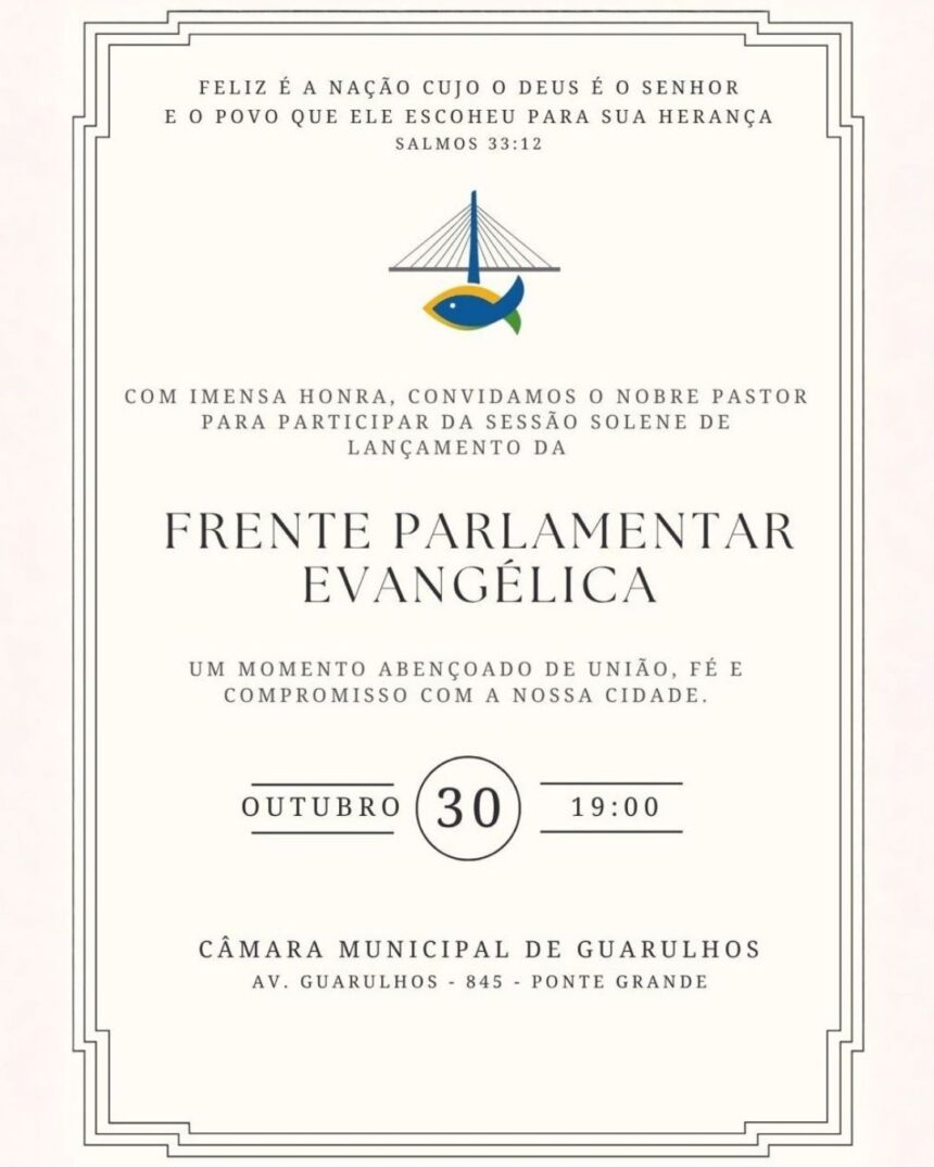 A Câmara Municipal de Guarulhos realizará, na próxima quarta-feira (30), às 19h, a sessão solene de lançamento da Frente Parlamentar Evangélica, proposta pelo vereador Pastor Adalberto Cardoso da Silva (Mobiliza). O evento, aberto ao público, acontecerá no Plenário da Câmara, localizada na Avenida Guarulhos, 845, Ponte Grande.
