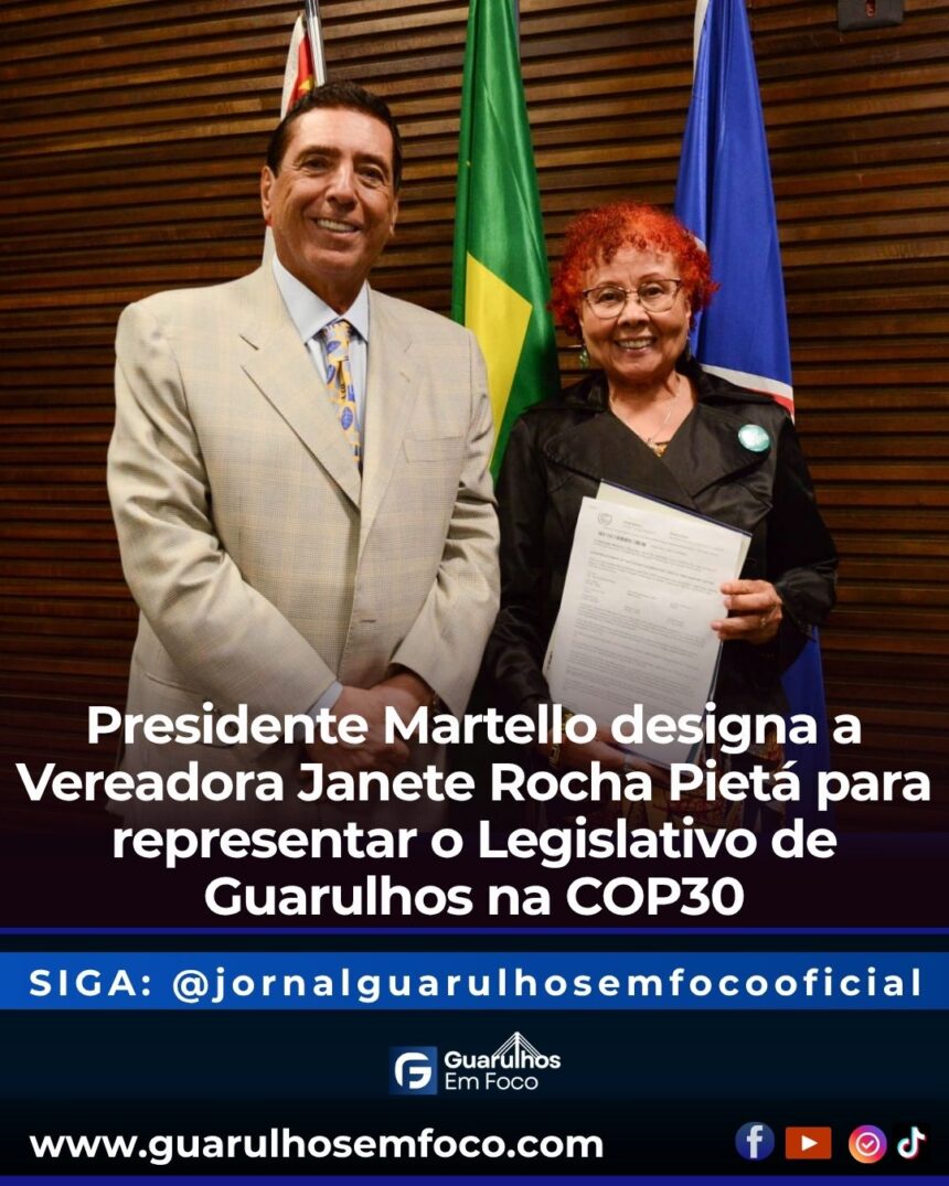 A vereadora Janete Rocha Pietá (Rede) foi designada pelo presidente da Câmara Municipal de Guarulhos, vereador Fausto Miguel Martello (Republicanos), para representar o Legislativo guarulhense na COP30 — 30ª Conferência das Nações Unidas sobre Mudança do Clima, que ocorrerá de 10 a 21 de novembro, em Belém (PA). O anúncio foi feito por Martello durante a sessão desta quarta-feira (05/11).