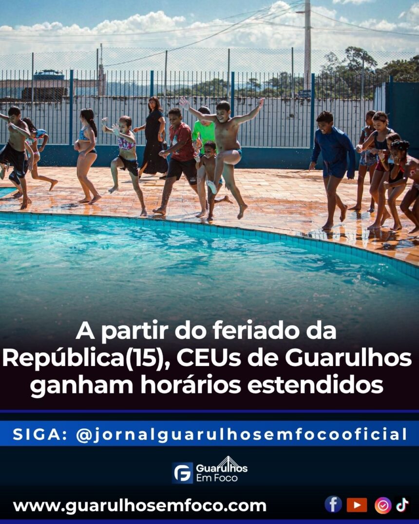 A partir do dia 15 de novembro, feriado da Proclamação da República, os Centros de Educação Unificados (CEUs) de Guarulhos ampliam os horários de funcionamento dos balneários públicos. Agora, as piscinas dos CEUs Bambi, Bonsucesso, Continental, Jardim Cumbica, Ottawa-Uirapuru, Paraíso-Alvorada, Pimentas e Presidente Dutra estarão abertas aos sábados, domingos e feriados, das 10h às 16h.