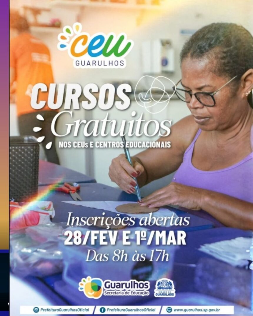 Neste sábado e domingo, dias 28 e 1º de março, das 8h às 17h, a Prefeitura de Guarulhos realizará um mutirão de matrículas nos cursos gratuitos oferecidos nos 13 CEUs, no CME Adamastor, no Cemear, no Cemea Parque Chico Mendes e no Parque Júlio Fracalanza. De forma inédita, a ação amplia o acesso para quem não pode comparecer durante a semana.
