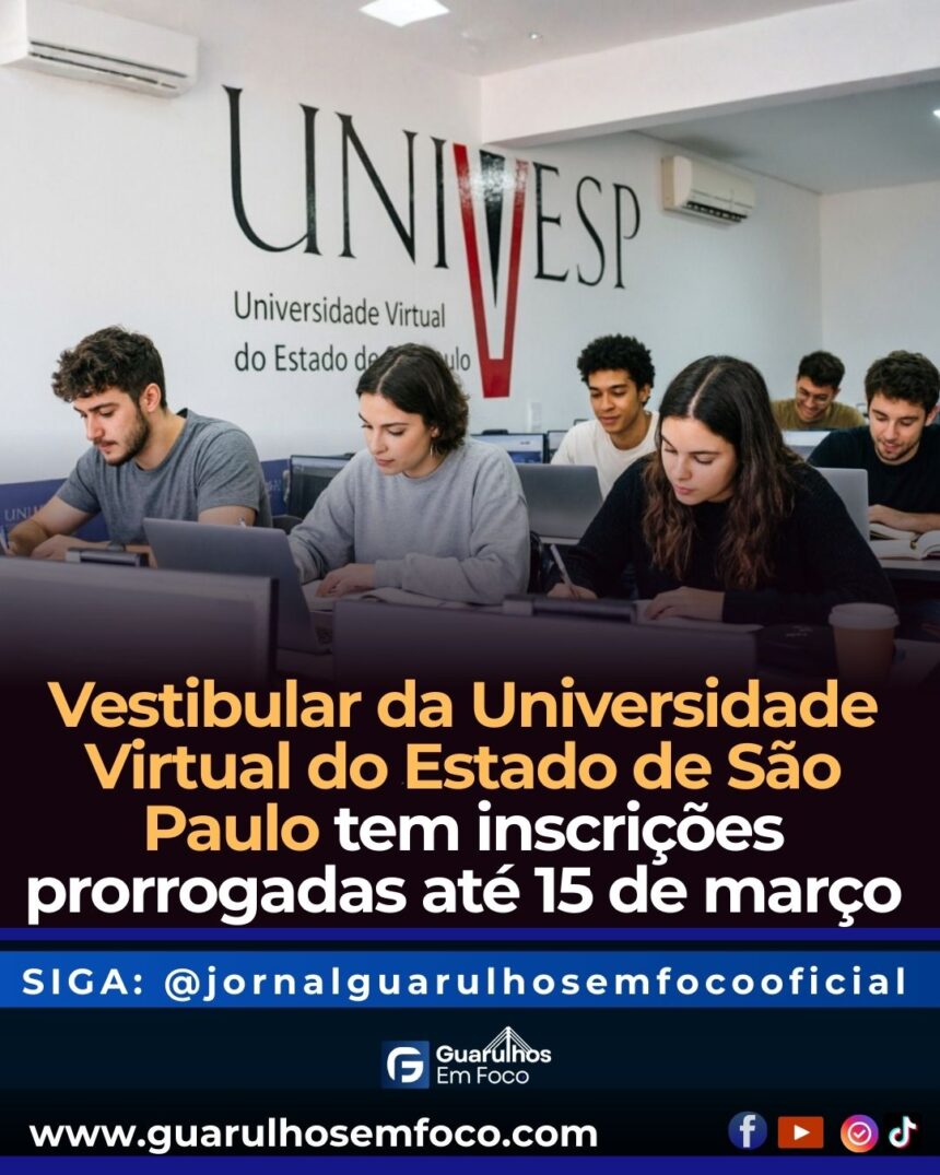 As inscrições para o Vestibular 2026 da Universidade Virtual do Estado de São Paulo (Univesp) foram prorrogadas até 15 de março, às 23h59. Ao todo, estão disponíveis 24.029 vagas gratuitas distribuídas em 456 polos localizados em 386 municípios do Estado de São Paulo, incluindo capital, interior e litoral.