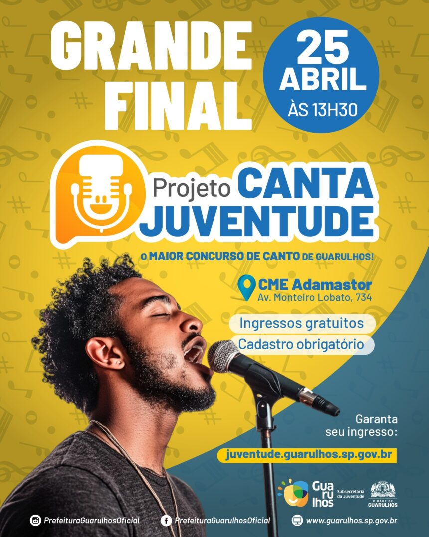 A grande final do concurso Canta Juventude 2025, promovido pela Prefeitura de Guarulhos, irá acontecer no sábado (25), às 13h30, no Adamastor (avenida Monteiro Lobato, 734, Macedo). Dezenas de jovens com idade entre 15 e 29 anos residentes no município inscreveram-se para o maior concurso de canto do município, e 29 deles foram selecionados por júri técnico para a apresentação final.