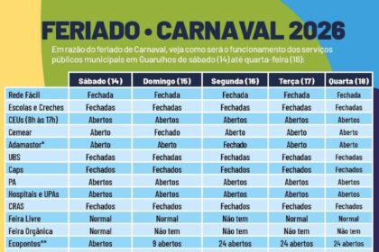 Serviços públicos municipais terão funcionamento diferenciado no Carnaval em Guarulhos. A Prefeitura…